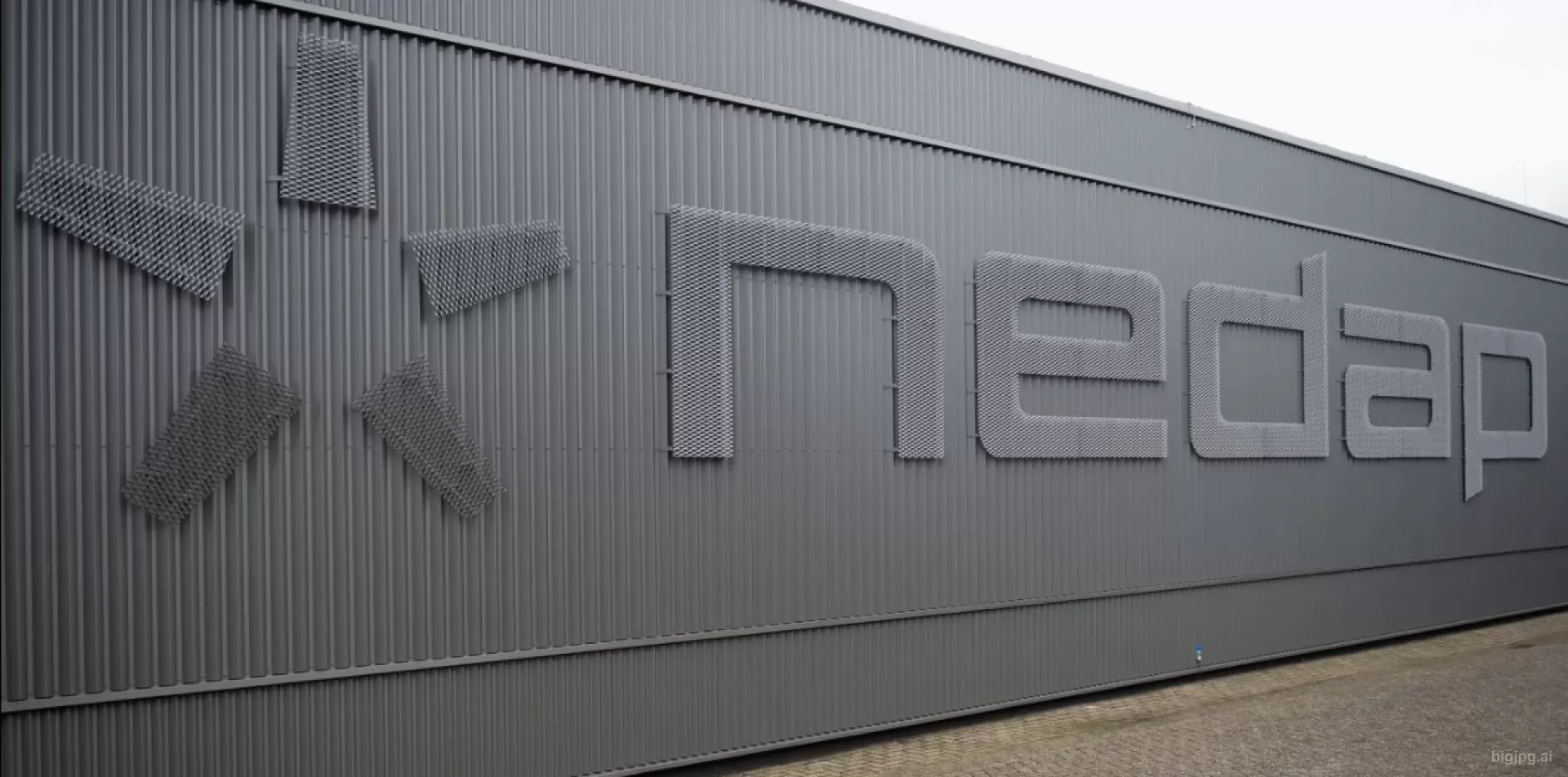 Company logo in expanded metal as a façade design element